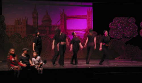 Die Bemalung der je 3 m x 6 m großen Leinwände “London” und “Hawai” dauerte ca. 2 Wochen.Die Bemalung der Büsche, Bäume und sonstiger Requisiten übernahmen engagierte Schülerinnen des Helene-Lange-Gyymnasiums in Fürth.