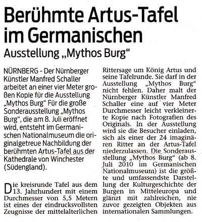 An einer nur leicht verkleinerten Nachbildung des überdimensionalen königlichen Tisches arbeite derzeit der Nürnberger Künstler Manfred Schaller, teilte das Germanische Nationalmuseum mit. Als Vorlage dienten dem Künstler Fotografien der kreisrunden Tafel aus dem 13. Jahrhundert. Das Original ist in der Kathedrale im südenglischen Winchester ausgestellt.