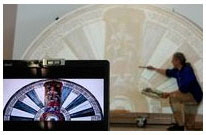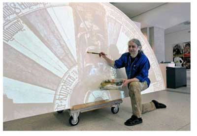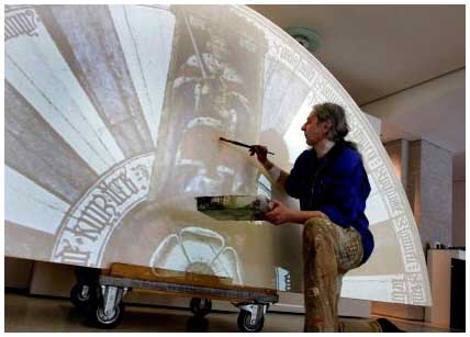Der Künstler Manfred Schaller malt am Mittwoch (02.06.2010) im Germanischen Nationalmuseum in Nürnberg nach einer Projektion die Tafel von König Artus aus der Kathedrale von Winchester (England) auf eine Platte.
