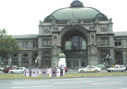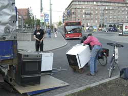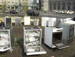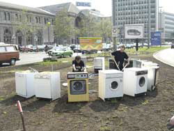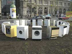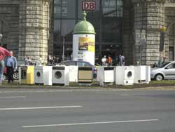 Antragsgemäß wird Ihnen hiermit in stets widerruflicher Weise die Erlaubnis erteilt, stadteigene öffentliche Wiesen-/Grünflächen auf dem Mittelstreifen (Verkehrsinsel) des Bahnhofsplatzes -entsprechend der vorgelegten Fotomontage- in der Zeit vom 08.05.2006 bis 15.05.2006 zur Durchführung einer Kunstaktion (Waschkreis) mit politischem Hintergrund zu benutzen. Gestattet ist die kreisförmige Aufstellung von ca. 20 Waschmaschinen als temporäres Mahnmal für die AEG Nürnberg.